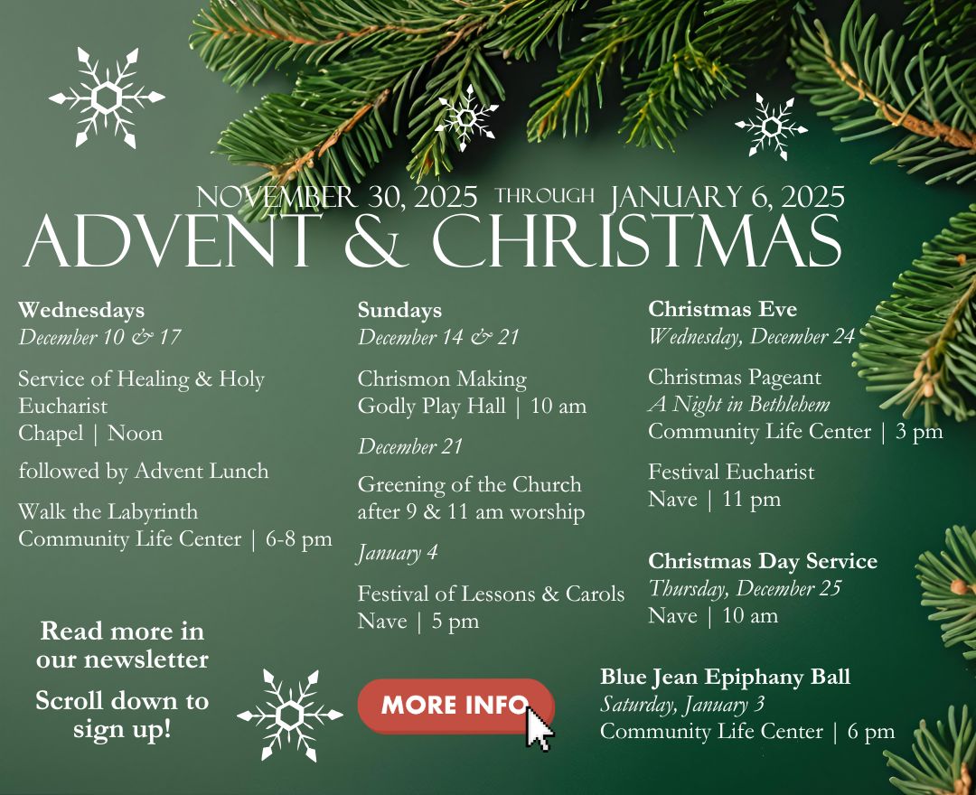 - 8 am: Rite II Prayer Book Eucharist in the Chapel of Christ the King